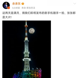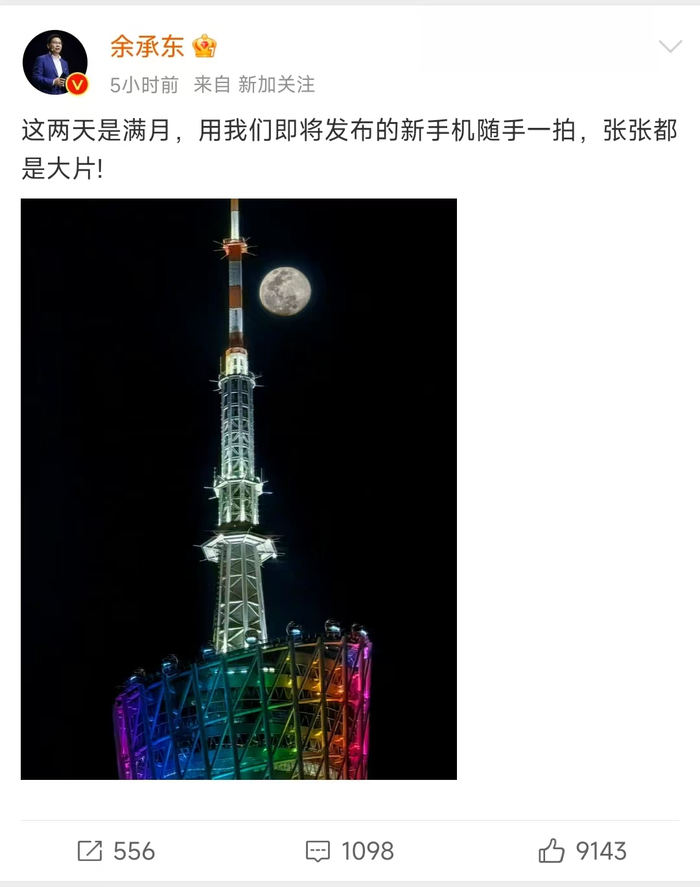 3月9日,余承东发布了一张用“新手机”拍摄月亮的照片,配文:“这两天是满月,用我们即将发布的新手机随手一拍,张张都是大片!”