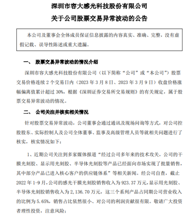 其中,容大感光表示,公司关注到多家媒体报道“经过公司多年来的技术攻关,公司的干膜光刻胶、显示用光刻胶、半导体光刻胶等产品已经面向市场实现了批量销售,其中部分产品已进入核心客户的供应链体系”等相关新闻。