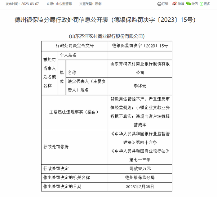 山东齐河农商银行被罚95万:因贷款用途管控不严等