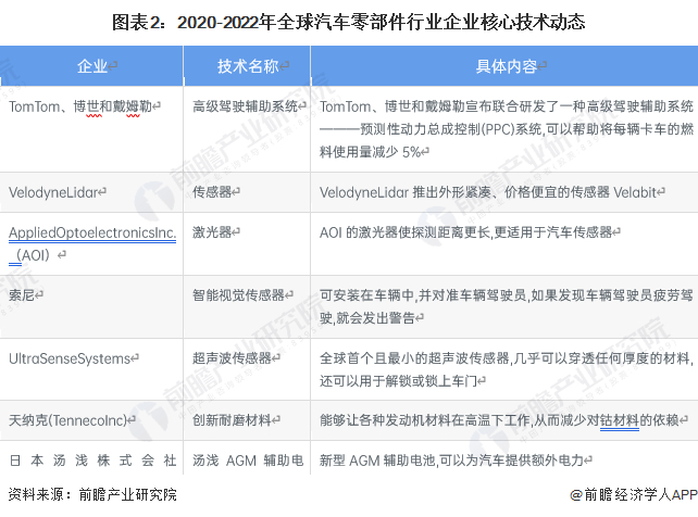 根据全球汽车零部件主要厂商博世集团公布的信息来看,目前全球范围内的汽车零部件厂商均在大力布局智能汽车、车联网相关的技术方案等。智能汽车零部件新技术包含计算机、现代传感、信息融合、通讯、人工智能及自动控制等技术。智能汽车零部件就是在网络环境下用信息技术和智能控制技术来控制的汽车组成部分,它是一个集环境感知、规划决策、多等级辅助驾驶等功能于一体的综合系统,它集中运用了计算机、现代传感、信息融合、通讯、人工智能及自动控制等技术,是典型的高新技术综合体。目前全球汽车零部件龙头企业正在加快核心技术布局,具体核心技术动态如下: