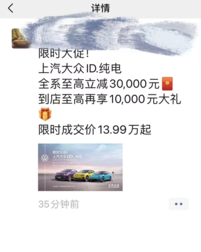 除此之外,3月10日,长安深蓝宣布凡在2023年3月10日~3月31日期间下定深蓝SL03并提车(提车以尾款支付时间为准)的客户,下定即享“八重好礼”和2.2万元厂家现金补贴支持政策;上汽大众相关销售人员也发布海报称,上汽大众ID.纯电全系至高立减30000元。到店至高再享10000元大礼,限时成交价13.99万起。