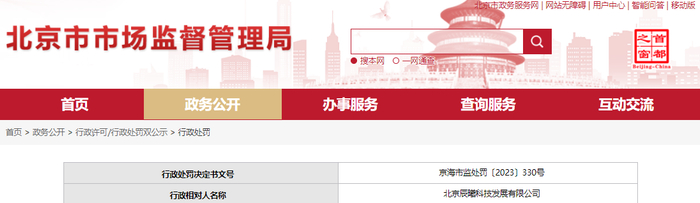 中国质量新闻网讯 近日从北京市市场监督管理局网站获悉,北京市海淀区市场监督管理局对北京辰曦科技发展有限公司作出行政处罚。行政处罚决定书文号:京海市监处罚〔2023〕330号。