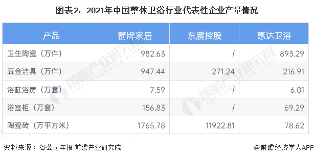 从中国整体卫浴行业代表性公司的产量情况来看,2021年,箭牌家居和惠达卫浴的卫生陶瓷产量在900-1000万件左右;箭牌家居的五金洁具产量超过900万件,远高于东鹏控股和惠达卫浴的200万件水平;箭牌家居和惠达卫浴的浴缸浴房产量相差不多,在6-7万套左右;东鹏控股的陶瓷砖产量超过1亿平米,远高于箭牌家居和惠达卫浴。