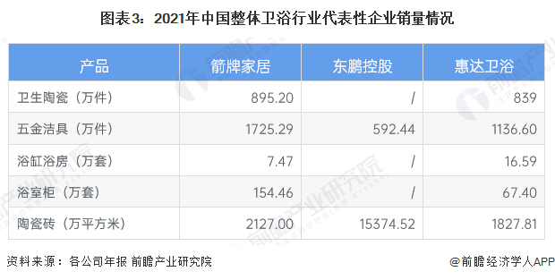 从中国整体卫浴行业代表性公司的销量情况来看,2021年,箭牌家居和惠达卫浴的卫生陶瓷销量在800-900万件左右;箭牌家居的五金洁具产量超过1700万件,惠达卫浴销量则超过1000万件水平,均远高于东鹏控股;惠达卫浴的浴缸浴房销量为16万套,远高于箭牌家居;东鹏控股的陶瓷砖产量超过1.5亿平米,远高于箭牌家居和惠达卫浴。