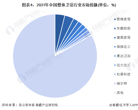 目前中国整体卫浴行业的龙头上市公司分别是箭牌家居、东鹏控股、建霖家居、海鸥住工。2021年,按公司销售收入来看,箭牌家居和东鹏控股市场份额均为4%,并列第一;其次是建霖家居、海鸥住工、惠达卫浴,市场份额均为2%。