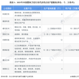 从中国整体卫浴行业代表性公司的产能情况来看,2021年,中国整体卫浴行业整体年产能在670万套以上。其中,东鹏控股、箭牌家居的生产基地数量最多,分别为12个和10个(含建设中项目)。