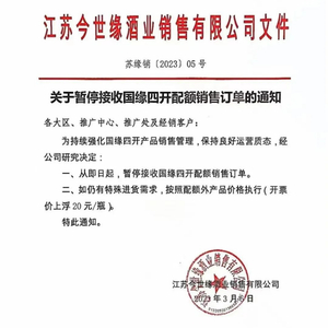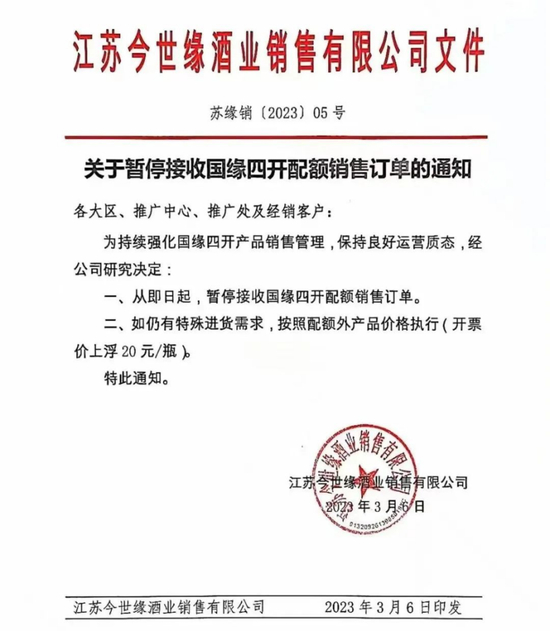 近日,有消息称,江苏今世缘酒业销售有限公司下发《关于暂停接收国缘四开配额销售订单的通知》。文件指出,为持续强化国缘四开产品销售管理,保持良好运营质态,公司研究决定:一、从即日起,暂停接收国缘四开配额销售订单。二、如仍有特殊进货需求,按照配额外产品价格执行(开票价上浮20元/瓶)。