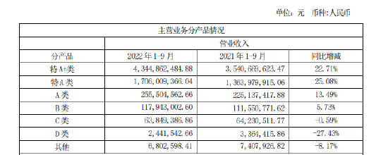 2022年前三季度,今世缘特A+类产品收入43.45亿元,同比增长22.71%;特A类产品收入17.06亿元,同比增长25.08%,特A类产品在总营业务收入中的比重为92.24%,而A类产品实现收入2.56亿元,同比增长13.49%。中高端产品为今世缘带来了96.79%的收入,显而易见,今世缘营业收入主要依靠中高端产品。