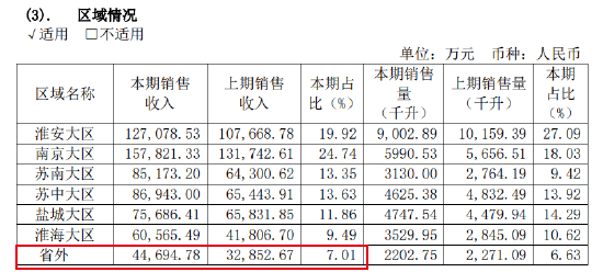 但是,提价显然不是拉动营收的最优解,“内忧外患”的处境中,今世缘还是需要调整区域结构,加速走向全国。