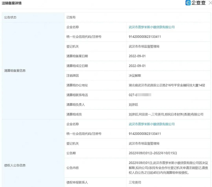 值得注意的是,2022年9月1日,武汉市普罗米斯小贷运营主体开始注销备案,注销原因是决议解散,并拟向公司/农民专业合作社登记机关申请注销登记,请债权人自公告之日起45日内向清算组申报债权,公告期为2022年09月01日-2022年10月15日。不过,金融虎网注意到,当前,该公司的经营状态又已变更为“存续”,存续一般指企业依法存在并继续正常营业。