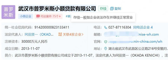 今年2月,博民快易贷武汉公司曾因“清算停业放弃债权”而备受业内关注。据博民快易贷官网显示,武汉市普罗米斯小额贷款有限公司于2013年11月在武汉成立的全资小额贷款有限公司,以博民快易贷作为服务品牌于2013年12月开始营业。企查查APP信息显示,武汉普罗米斯小额贷款有限公司成立于2007年5月10日,注册资本3亿元,法人为冈田贤一。