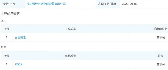 金融虎讯 3月9日消息,今日,博民快易贷运营主体深圳普罗米斯小额贷款有限公司发生工商变更,奥山徹退出总经理、董事职务,内藤良太退出董事,新增礒崎孝纪和川本喜幸为董事,董事长安和人兼任总经理职务。
