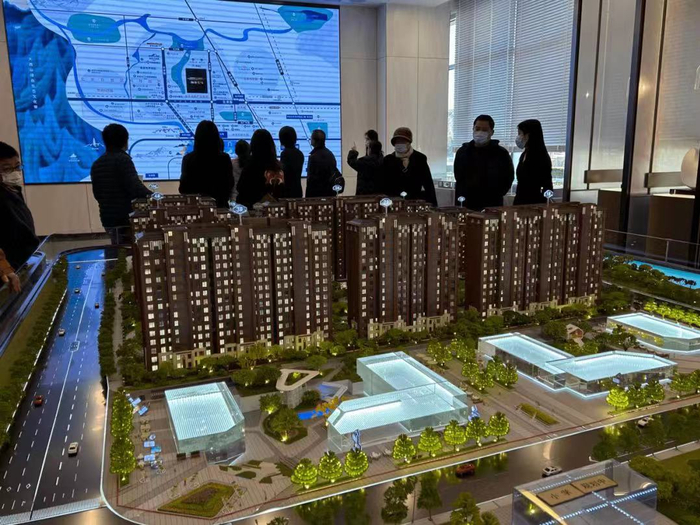 海开栖海沄颂售楼处,置业顾问为购房者讲解楼盘。摄影:刘昕