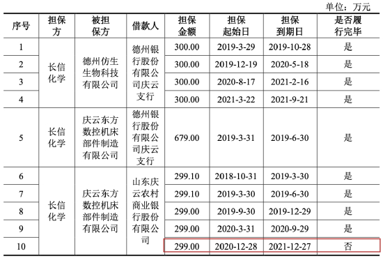 2020年12月28日,长信化学为庆云东方数控机床部件制造有限公司借款299.00 万元提供担保,该笔借款应于2021年12月27日到期。