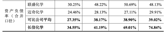 值得注意的是,报告期内,长信化学的资产负债率持续高于同行可比公司均值。