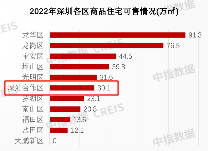 截至到2022年末,深汕合作区商品住宅可售面积共有30.1万㎡,和光明区差不多,在深圳排名第六位。