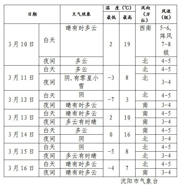 预计11日早晨到13日早晨,沈阳市和平区、沈河区、铁西区、皇姑区、大东区、于洪区,沈抚改革创新示范区的最低气温将下降8℃到10℃,13日早晨最低气温零下9℃到零下7℃。预计11日白天偏北风4到6级,阵风7级,请注意防范。