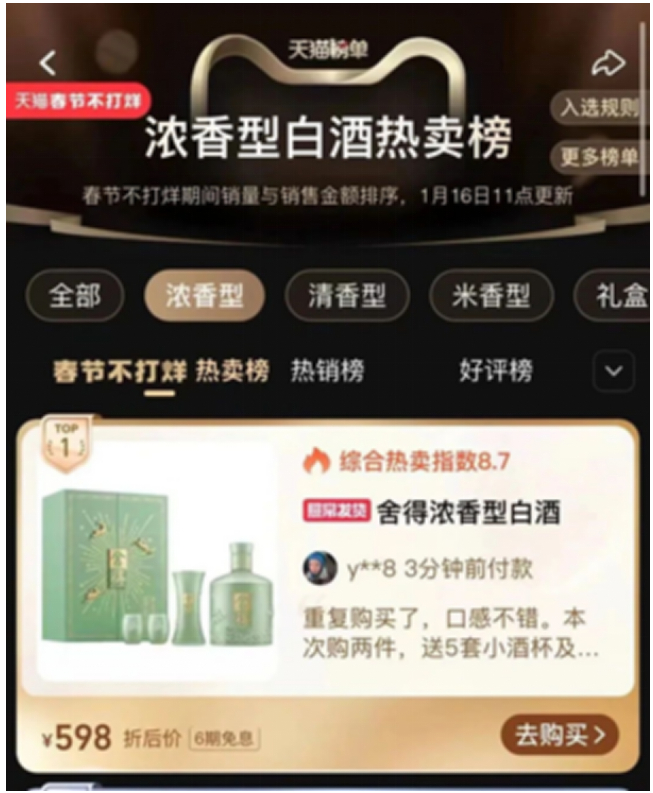 根据白酒行业专业媒体“微酒”报道指出,舍得酒业在今年春节期间多线发力夺得“开门红”,全系产品的消费者开瓶扫码瓶数同比增长116%。其中,线上销售同比大增55%,兔年生肖酒·追星款荣获京东白酒新品交易榜单第一名、荣获天猫浓香型白酒榜单第一名。此外,智慧·舍得(双支装礼盒)还荣获京东白酒新品交易榜单第二名。