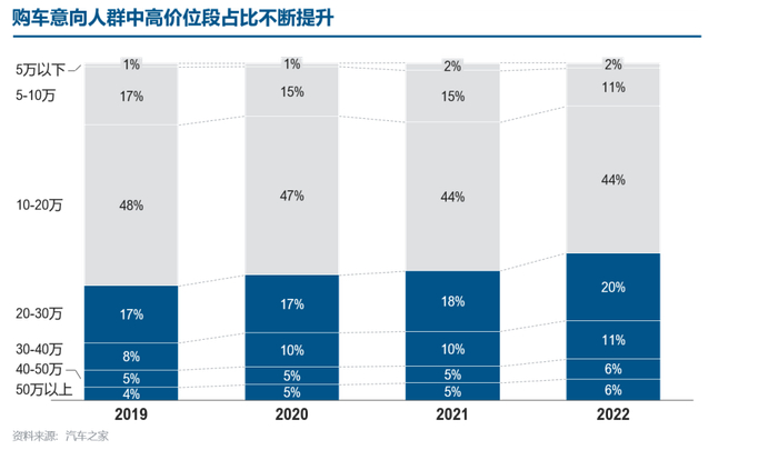 汽车之家购车意向数据显示,2019年至2022年期间,整车销售价格低于20万元的购车意向占比持续下滑,而价格在20万元以上的汽车自2019年以来占比持续上升;其中,20-30万元及30-40万元价位段汽车整体份额上升趋势更为明显。