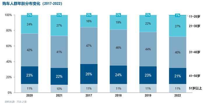 在社会经济不断发展的宏观背景下,年轻群体的高消费能力与开放的消费观念使得汽车成为其提高生活品质的必需品。汽车之家车主数据显示,2017年至2022年期间,21-30岁的购车人群在短短五年间则增长了11%,购车人群的用户结构重心不断向30岁以下的年轻人群转移。因此,车企对于年轻群体的心态理解和价值观洞察将更为重要。