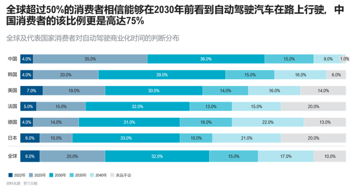 消费者的年轻化在一定程度上也意味着消费者对于新鲜事物接受度的不断增强,在心态上更愿意“尝鲜”,对于汽车智能网联新技术有着更明显的偏好与更高的接受度。根据罗兰贝格《汽车行业颠覆性数据探测》的最新观察,全球超过50%的消费者相信能够在2030年前看到自动驾驶汽车在路上行驶,中国消费者的该比例更是高达75%。自动驾驶相关功能正逐渐成为消费者购车时的重要考虑因素。