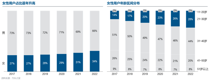 同时,女性群体的社会地位与话语权大幅提升,对国内消费市场的影响力不断扩大。2022年,女性在新购车用户群体中的占比已提升至34%,其中,21-30岁的年轻女性在新购车女性中的占比上升了14%,拥有50-200万可投资产的比例也大幅提升。“年轻化”、“高消费能力”也成为女性购车用户的显著标签。