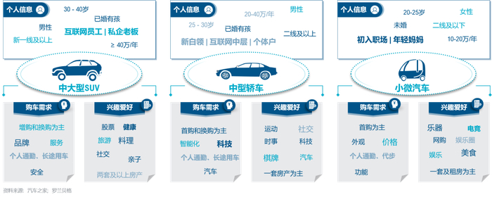 小微型汽车:目标用户多为初入职场人士和年轻妈妈,年龄在20-30岁,年收入在10-20万之间的女性为主。购车的主要目的是日常代步和上下班通勤,关注汽车外形设计、智能化用车体验与续航能力。关注网购、娱乐圈新闻和美食等相关话题。
