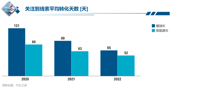 因此,新能源时代消费者在选购过程中的竞品对比时间大幅降低,从浏览、试驾到购车等整体流程耗时显著缩短。根据汽车之家数据,新能源车消费者从对比浏览到留资花费的平均时间整体低于燃油车用户。从实践经验来看,新能源车用户在网上充分对比浏览后,到访2-3家门店就会做出最终的购买决策,而传统燃油车用户则平均到访3-5家。