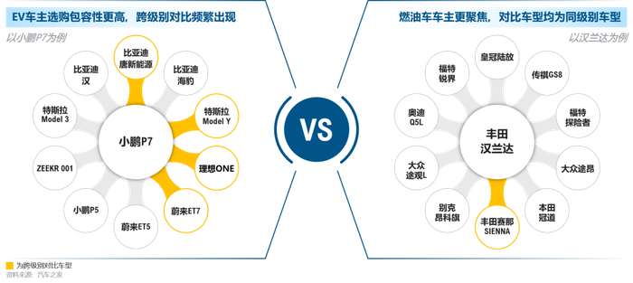 但新能源用户在选购时却对车身形式的认知界限变得模糊,转而以判断产品的算力水平、探头数量等参数指标寻找同一水平的产品,以致于跨级别对比频繁出现,以小鹏P7为例,除了汉、Model 3等同级别车型,也出现了蔚来ET7和理想ONE等跨尺寸级别的车型。