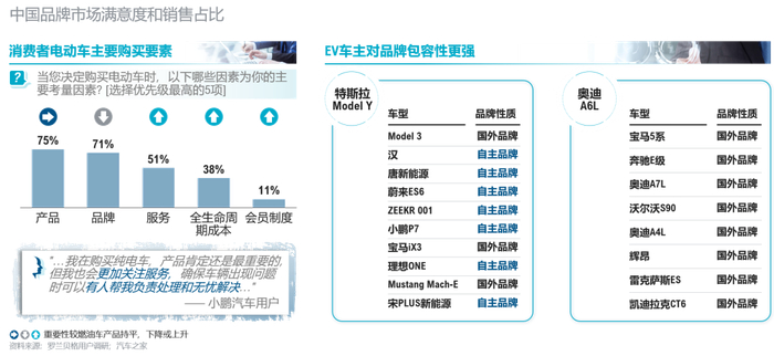 调研发现,消费者对品牌的重视程度呈下降趋势,认为服务、全生命周期成本和会员制度更为重要。品牌效应弱化使消费者在面对产品选择时更加包容。对比传统品牌车主与新能源品牌车主的购车选择来看,传统国外高端车品牌的车主在进行品牌对比时,通常选择国外或合资品牌,为传统意义上的“竞品”;而国外新能源品牌车主在品牌对比过程中,则会综合考虑国内及国外汽车品牌。因此,车企面临的竞争范围进一步加大。