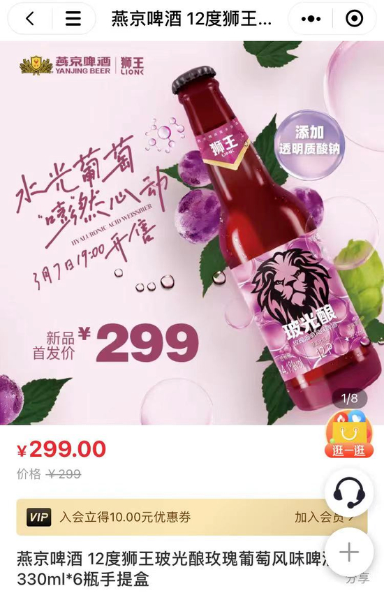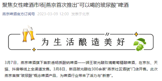 据燕京啤酒公众号,燕京啤酒旗下首款透明质酸钠啤酒——狮王玻光酿玫瑰葡萄精酿啤酒,3月7日在京东、天猫、抖音等线上全渠道发售。3月8日,该款“玻尿酸”啤酒在300余家“燕京社区酒號”门店开售。