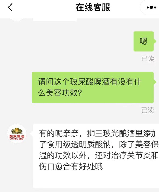 在3月10日,有媒体再次在燕京啤酒公示的多渠道询问,该款“玻尿酸”啤酒是否具有美容保湿等功能,客服一改此前表述,否认了美容等功效,表示该款产品仅为“适口的果啤”。