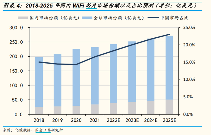 WiFi 6芯片从2019年开始出货,国金证券研报预计到2025年,WiFi 6的市场份额将占到全部WiFi芯片的52%左右,其中包括WiFi 6E芯片。