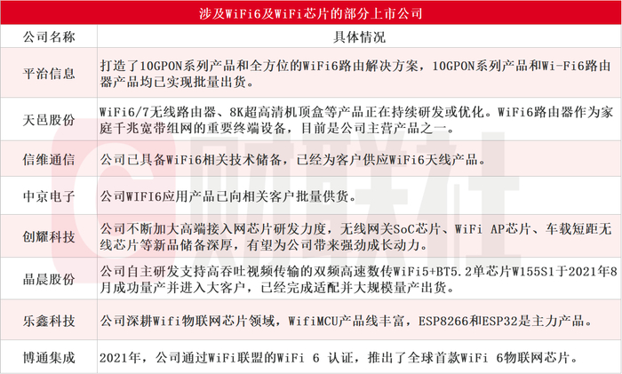 据财联社不完全统计,涉及WiFi6及WiFi芯片的上市公司主要有平治信息、天邑股份、信维通信、中京电子、创耀科技、晶晨股份、乐鑫科技、博通集成等,具体情况如下: