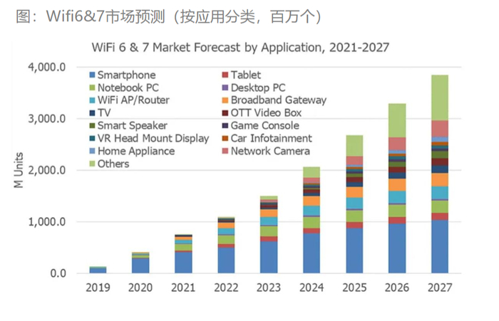 智能家居、汽车和嵌入式物联网应用支持WiFi设备出货量增长。根据TSR,WiFi市场预计2022年约为45亿台,到2027年将达到约57亿台。