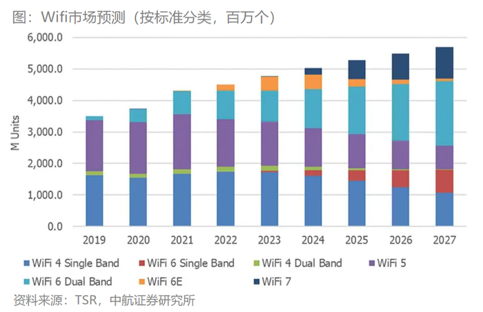 中航证券研报指出,2022年WiFi6约占WiFi市场总量的24%。到2027年,WiFi6和WiFi7将占WiFi市场的2/3左右。6GHz WiFi6E和WiFi7将从2022年的4.1%增长到2027年的18.8%。