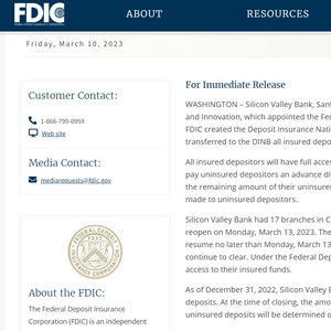 非常罕见的是,加州的金融监管部门在周五交易时间段内便以“流动性不足和资不抵债”勒令硅谷银行关门,并指定联邦存款保险公司(FDIC)接手。硅谷银行的资产随即转移至新设立的圣克拉拉存款保险银行,存款人最晚能在下周一拿到存款保险金。对于超出存款保险上限25万美元的部分,FDIC仅表示会在下周内预付一笔款项,但没有更具体的说明。