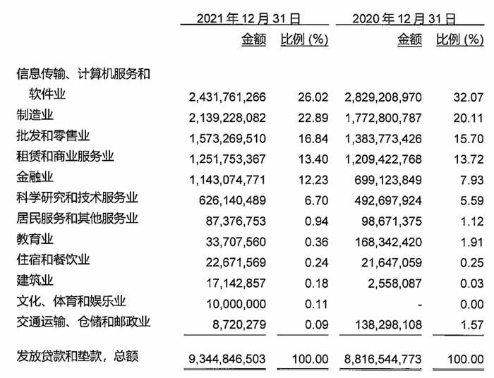 浦发硅谷银行贷款投向了哪里?审计报告显示,截至2021年末,该行贷款主要投向信息传输、计算机服务和软件业,制造业,批发和零售业,租赁和商业服务业以及金融业,其中信息传输、计算机服务和软件业占比最高,达26.02%。