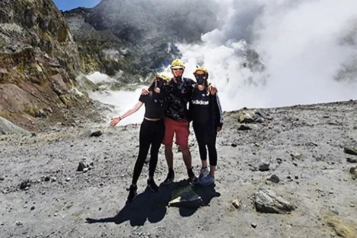 Paul、Krystal、Stephania Browitt在新西兰怀特岛旅游,这张照片是在火山爆发前6分钟拍摄的。