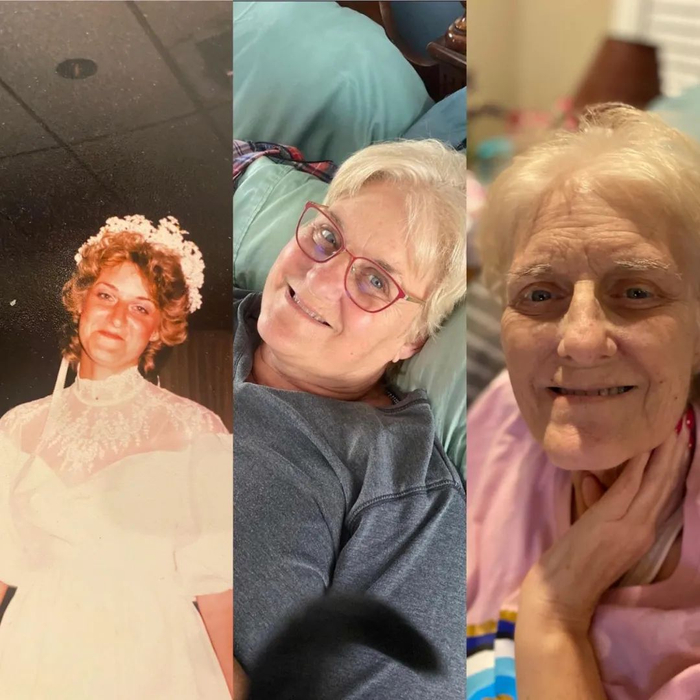 我最爱的母亲在她婚礼当天(1983年);她摔倒那天,发现了肾癌(2020年3月);她去世前一周时。