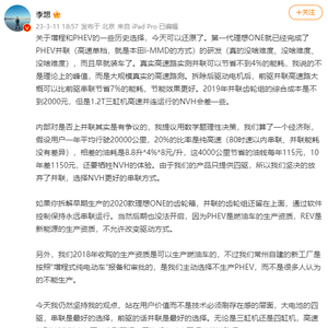 理想汽车CEO李想3月11日在微博回顾了“关于增程和PHEV的一些历史选择”。他说,第一代理想ONE就已经完成了PHEV并联(高速单档,本田i-MMD的方式)的研发,他还补充说,这一技术“真的没啥难度、没啥难度、没啥难度”;当时公司内部对是否上并联存在争议,李想提议用数学题理性决策,算经济账,假设用户一年平均行驶20000公里,20%的比率是纯高速(80时速以内串联、并联能耗没有差异),相差的油耗是8.8升*4%*8元/升,这4000公里节省的油钱每年115元,10年差1150元,“还要牺牲NVH的体验”。由于理想的产品只提供四驱,所以最后坚决放弃了并联,选择NVH的串联方式。