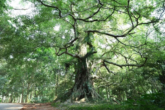 在当地老百姓的保护下,经过多年的繁衍,形成“独木成林”的奇观。四季变换,王朝更迭,如今的古榕已是九世同堂,千丝万缕的气生根形成“根帘”,似殿堂、如回廊,光入土长成的支柱根就达200余根,几乎以一己之力庇荫众生。
