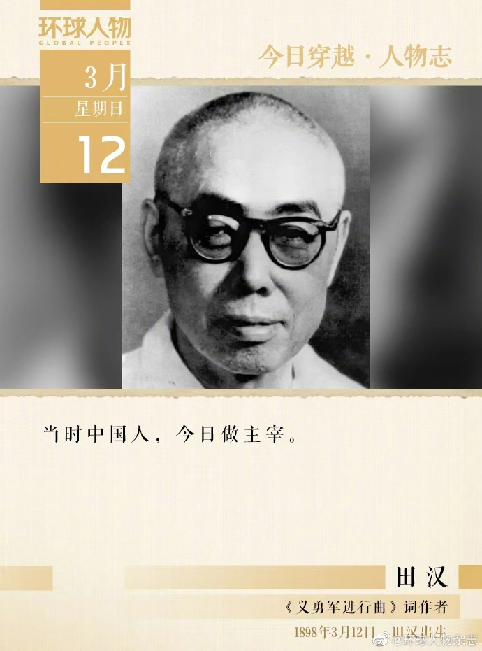 1898年3月12日,田汉出生。“起来,不愿做奴隶的人们……”《义勇军进行曲》激荡人心的歌词,出自我国革命戏剧运动的奠基人和戏剧改革运动的先驱者田汉之手。他毕生奉献于文化艺术事业,创作了话剧、歌剧60余部,电影剧本20余部,戏曲剧本20余部,歌词和新旧体诗歌近2000首,被党和人民誉为一位杰出的时代歌手。