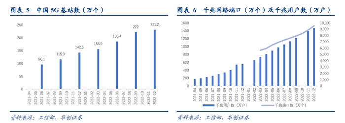 截止2022年12月底,我国共建成231.2万个5G基站,具备千兆网络服务能力的10GPON端口数达1523万个。较上年末接近翻番水平。千兆用户数9175万户,规模为上年末的2.7倍。