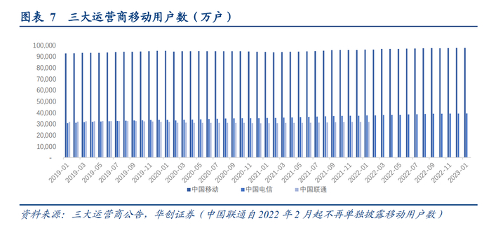 2023年1月,中国移动移动业务客户总数已达9.76亿,净增用户50.3万,其中5G套餐客户数为6.22亿,当月净增847万;中国电信移动用户数为3.92亿,净增用户113万,其中 5G套餐用户数为2.73亿,单月净增503万;中国联通“大联接”用户累计到达数为8.73亿,净增用户1100万,其中5G套餐用户累计到达数为2.16亿,单月净增307万。