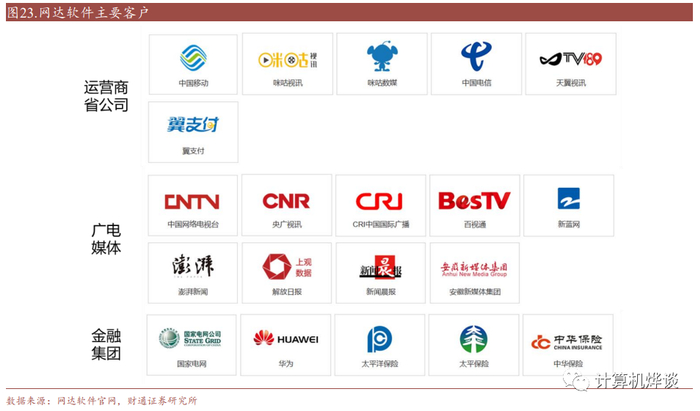 创维数字作为全球数字机顶盒龙头,持续深耕全球电信及广电运营商B端客户。当虹科技为国内视频编解码龙头,视频解决方案产品主要面向三大运营商等,提供视频内容采集、生产、运营等全产业链相关产品及服务,是公司收入主要来源,2022H1占比达80.6%,尤其与中国旗下的咪咕保持了紧密的合作关系。浪潮已成为中国移动、中国联通、中国电信的OSS重要合作伙伴之一,并作为核心成员长期参与三大运营商相关业务标准制定和规范编写等工作。网达软件专注于大视频领域,积极与运营商合作,开拓VR与AIGC方向的新应用。