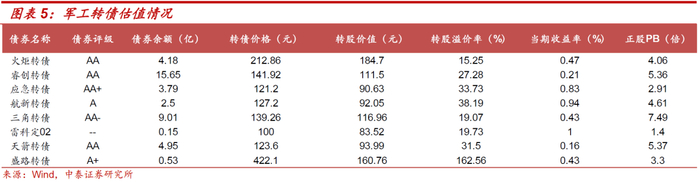 军工转债呈现出偏股型和平衡型的特征。火炬转债(AA)、睿创转债(AA)、三角转债(AA-)和盛路转债(A+)为偏股型,正股PB为4.06倍、5.36倍、7.49倍和3.3倍,应急转债(AA+)、航新转债(A)、和天箭转债(AA)为平衡型。