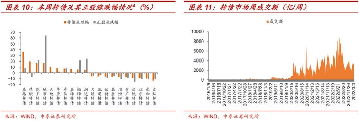 本周中证转债指数较上周下跌1.20%,报收402.90点。从个券表现来看,整体涨跌互现,其中涨幅前三的是盛路转债,精锻转债,花王转债,涨幅分别为36.21%、20.12%、17.77%;跌幅前三的分别是文灿转债、永和转债、远东转债,跌幅分别为-13.83%、-10.02%、-9.63%。本周转债市场成交金额为3435.94亿元,日均成交金额为687.19亿元,较前一周上涨4.19%。