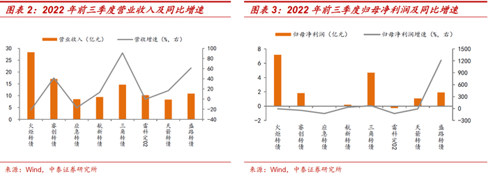 - 军工板块转债现状如何?1)军工转债对应的正股经营有所分化。8只转债正股营业收入三年复合平均增长率为19.77%;净利润三年复合平均增长率为-42.67%。2)军工转债估值处相对低位。2022年,军工转债转股溢价率在35%-69%范围内震荡。本周,转债平均价格为173.52元,转股溢价率明显分化,平均转股溢价率在38%-43%之间,约为2022年全年水平的16%分位,估值水平偏低。3)军工转债呈现出偏股型和平衡型的特征。结合军工转债正股基本面及转债估值情况,三角转债建议关注。三角防务2022年前三季度营业收入和归母净利润分别同比增长91%和70%,业绩预告显示2022年度公司净利润增长幅度在46%-58%之间,成长性可观。