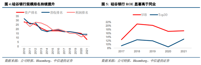 硅谷银行的资负结构非常简单,存贷业务利率优势显著。负债端,硅谷银行存款占比长期高达95%以上。硅谷银行服务创投企业,同时要求企业将经营账户开设在硅谷银行,吸收了大量不计息存款,近5年硅谷银行不计息存款平均占比高达74%(同业:33%),较低的存款成本基础是硅谷银行的竞争优势所在。资产端,硅谷银行主要以贷款和证券投资为主,2021年前,贷款和证券投资基本各占“半壁江山”,现金类资产占比在5%-15%之间。硅谷银行发放的创投企业贷款风险溢价高,同时通过股权或期权协议获得投资收益,贷款综合收益在长期限内显著领先于同业。在高收益、低成本的资负两端优势下,硅谷银行规模不断提升,ROE持续领先行业。